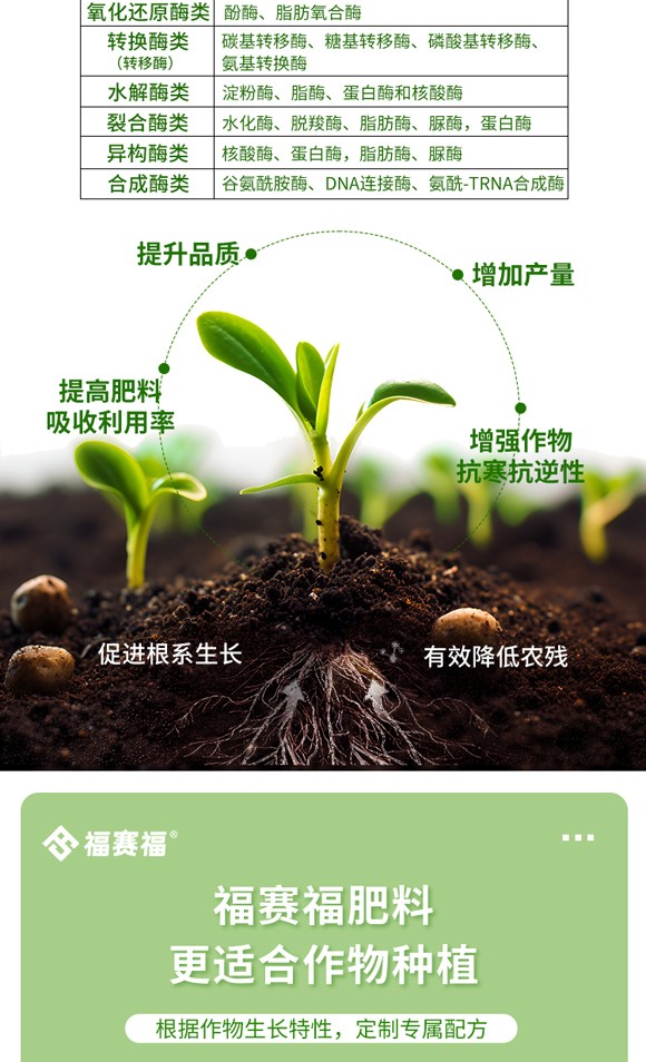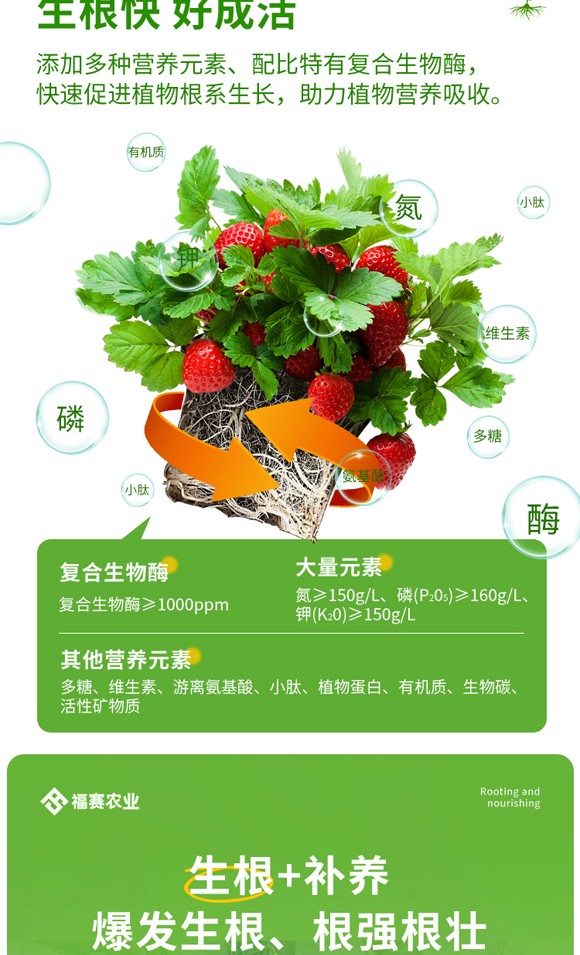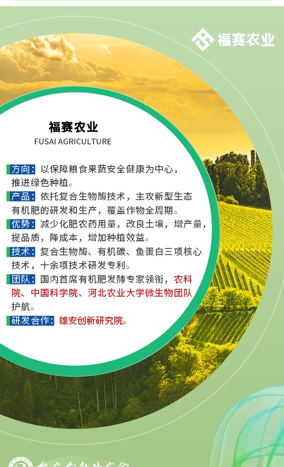 依托自主高新技術(shù)—復(fù)合生物酶技術(shù)緊隨國家綠色高品質(zhì)農(nóng)業(yè)發(fā)展政策和農(nóng)產(chǎn)品市場消費(fèi)升級趨勢福賽集團(tuán)注冊成立河北福賽農(nóng)業(yè)科技有限公司,以確保糧食果蔬健康為核心,以節(jié)肥增效、減藥控害為研發(fā)方向,聚焦新型有機(jī)肥的研發(fā)與生產(chǎn),為農(nóng)業(yè)增效,助農(nóng)民可持續(xù)性增收!截止目前,公司構(gòu)建了以生物發(fā)酵液體有機(jī)肥為核心的產(chǎn)品體系,包括魚蛋白肥系列
